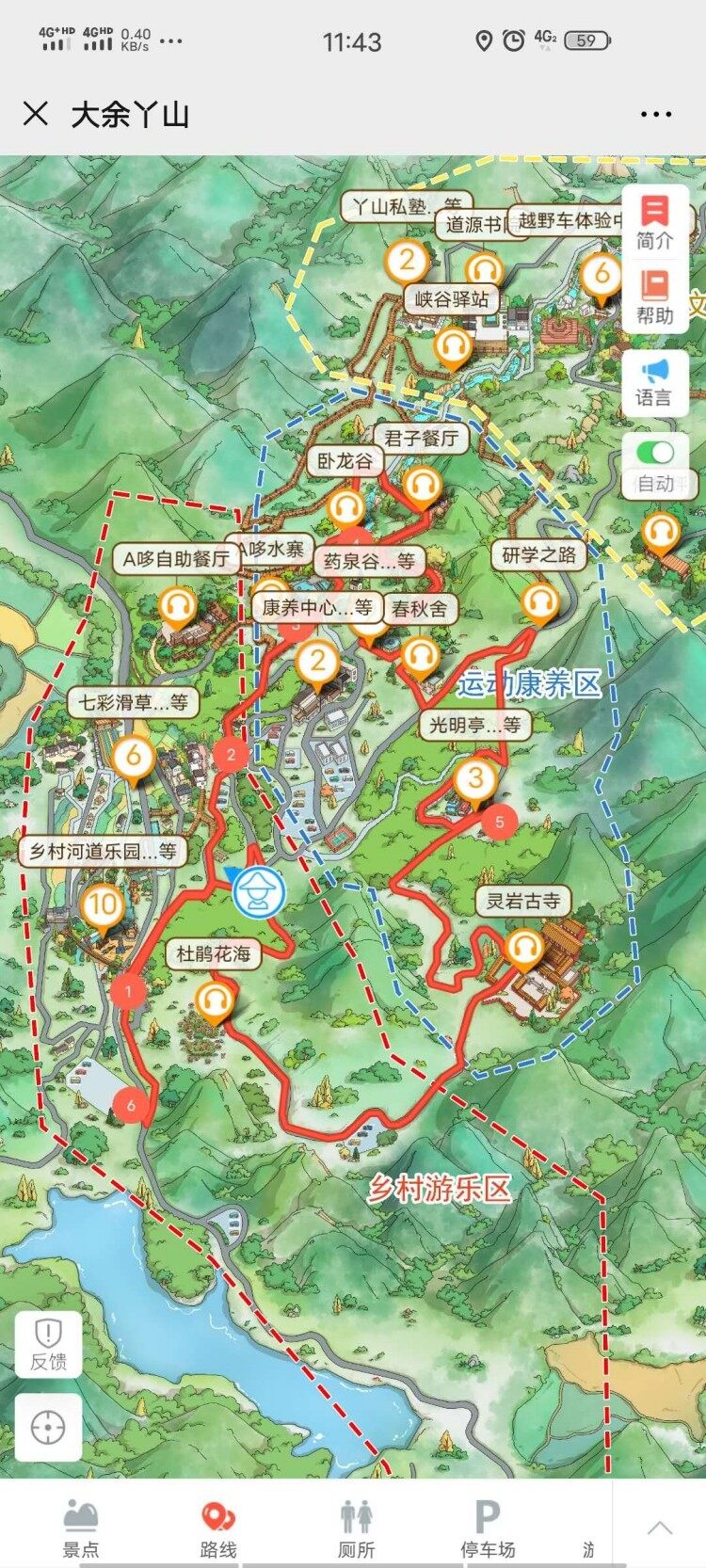 游客中心(購票)---幸福天路---A哆水寨---臥龍谷---森林棧道---A哆森林(乘車)---游客中心停車場