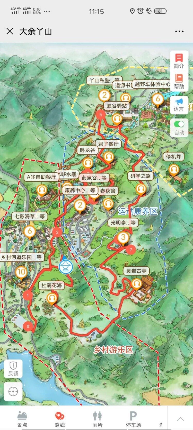 游客中心(乘車)---幸福天路---臥龍谷入口---天行健---蘭花谷---森林棧道---A哆森林(乘車)---返回游客中心停車場