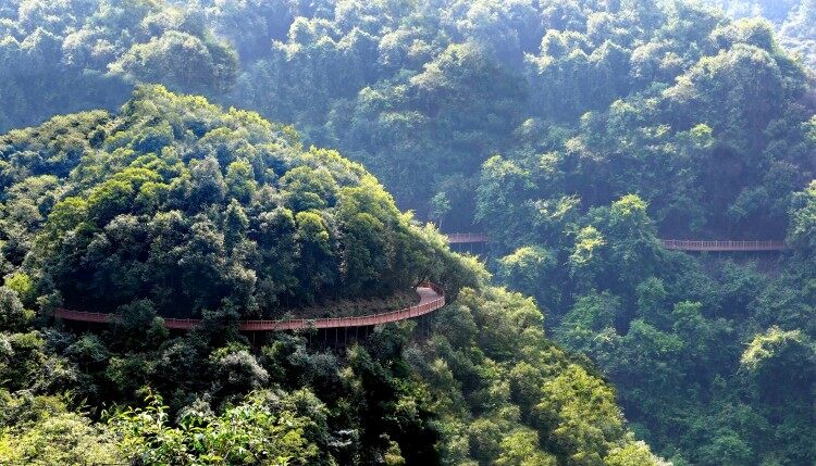 走到幸福天路的盡頭便是臥龍谷入口處,從這個“竹林清風”的入口我們將登上世界首條最長、最美的山地微馬棧道——天行健,這是丫山人用環保木塑打造的世界首條最長、最美的環山微馬棧道。常走天行健還有天然森林療養、仙境修行、運動健身等保健功能哦!